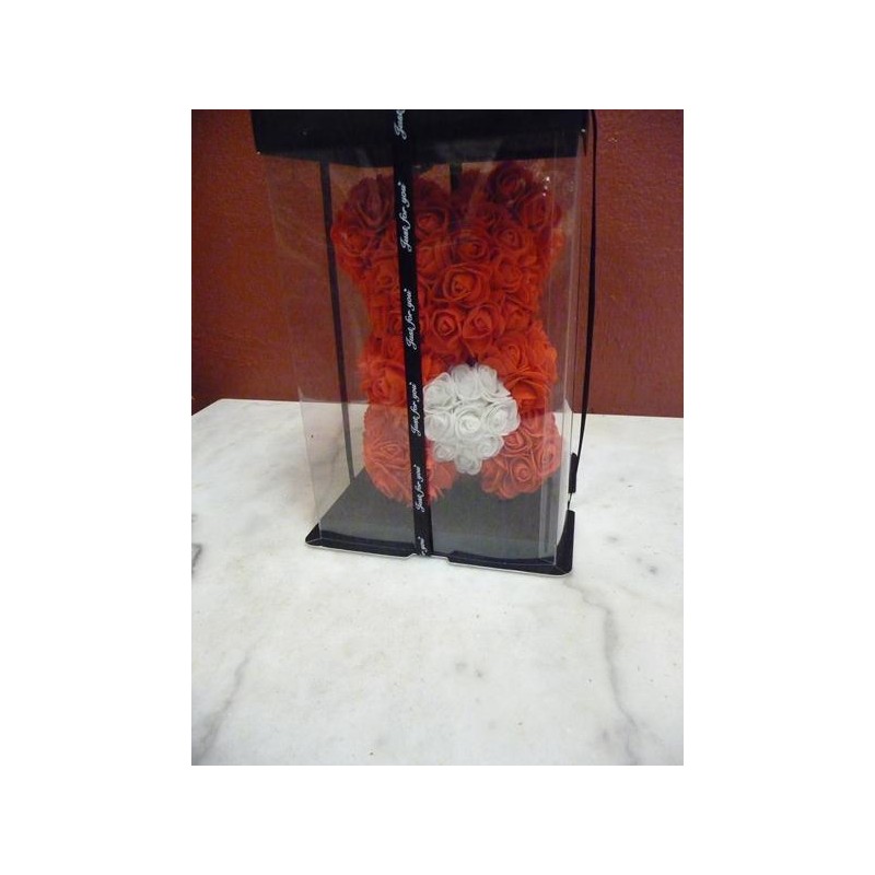 Nounours composé de roses artificielles mesure 26 cm de hauteur est livré dans sa boîte